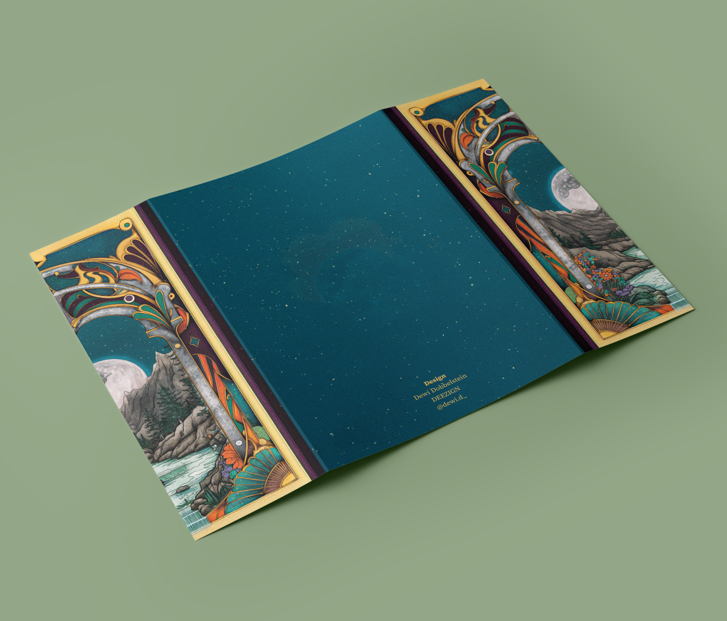 The front illustration was hand-drawn, inspired by a blend of fantasy and Jugendstil (Art Nouveau) elements to create a rich, enchanting feel.